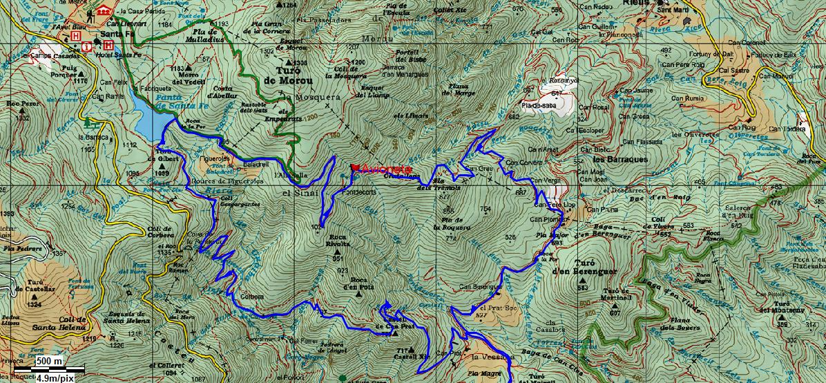 Per tornar,s'ha de continuar seguin les indicacións Riells fins a un punt que es deixa i continua per una pista molt poc transitada, que hi ha a la dreta. Al cap d'una estona,s'abandona la pista per seguir un petit corriol a l'esquerra (atenció que quasi no es veu) i des d'aquí cada cop la pista es veu més transitada fins a trobar la principal que va a de Riells cap a Gualba per tornar al punt de sortida.