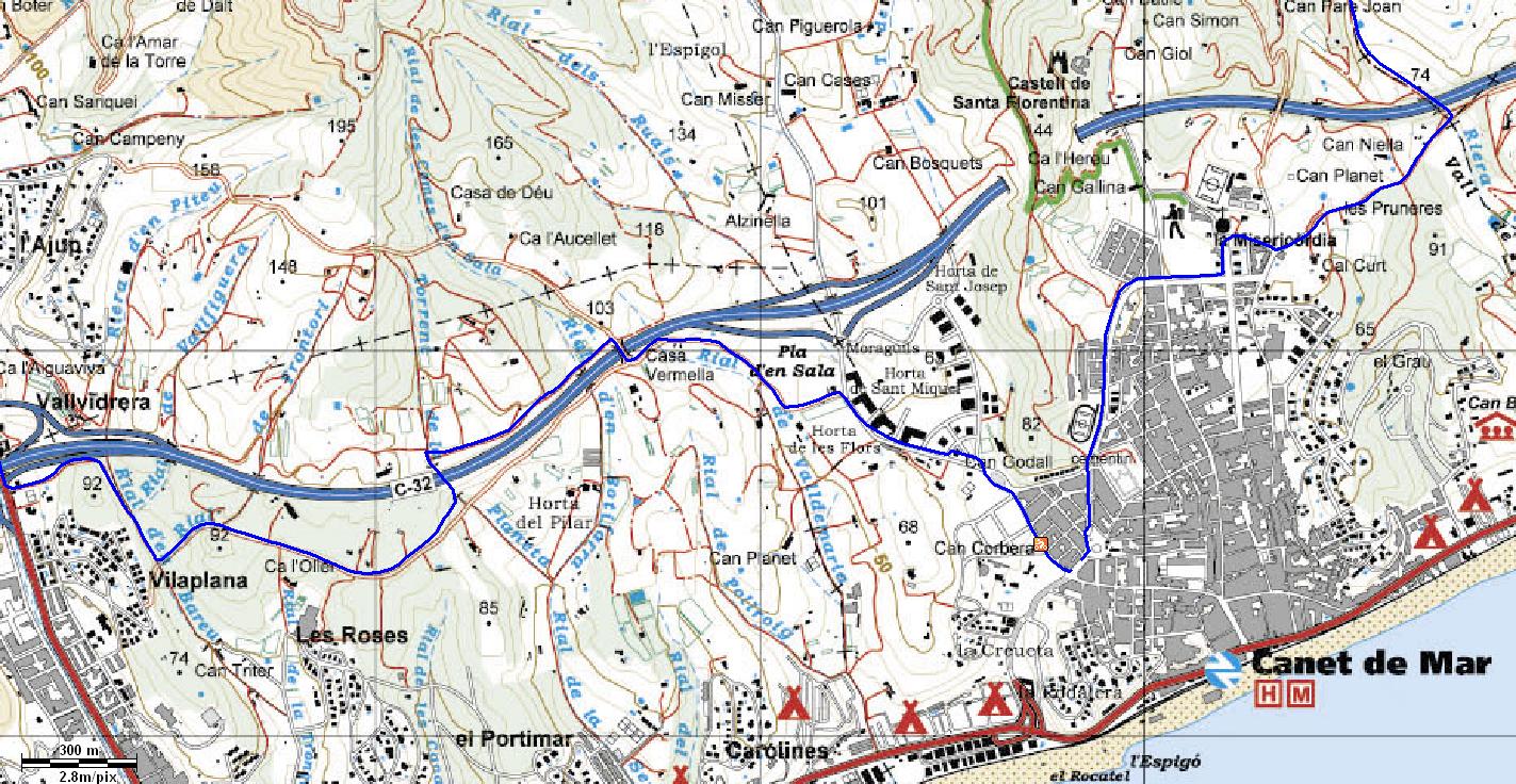 La ruta comença a la plaça 11 de Setembre direcció oest per anar cap al Castell Gelpí i El Remei per arribar a la riera de Torrent-bo. Aquí comença una pujada que pràcticament no para fins a la Pedra de la Ferradura (atenció: des de les planes d'en Montal fins a la Pedra de la Ferradura es molt dur es per nivell alt de BTT). Ara comença un puja i baixa amb molt bona vista de Mataró per anar fins Arenys de Munt passa'n per el Coll Pallarès (Santa Mònica),la Font del Malpàs,Creu de Rupit (atenció la ruta gira a l'esquerra 25mts abans d'arribar-hi) i El Corral del Forn. Abans D'Arribar al Turó de ca l'Amar la ruta deixa la pista principal( tot baixada) per passar per un corriol ( el camí amagat) que ens durà fins a la Mare de Déu de Lourdes i fins Arenys de Munt. Ara la ruta va direcció a la Creu de Canet per la pista normal i de la Creu a Canet per un corriol.